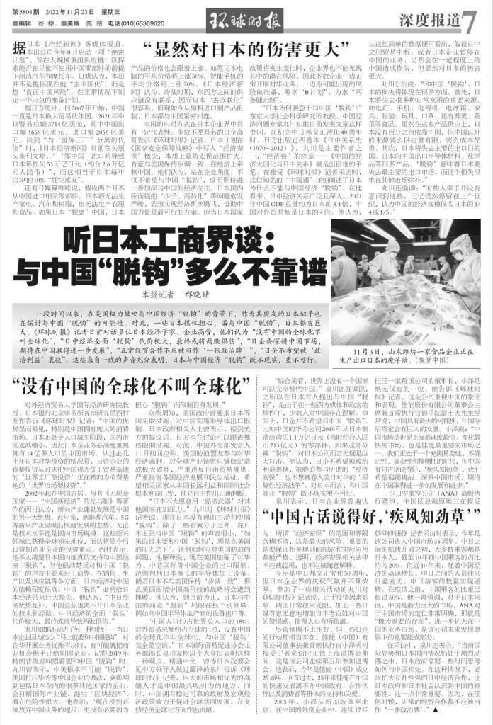 環球時報「听日本工商界谈:与中国“脱钩”多么不靠谱」にコメントしました。