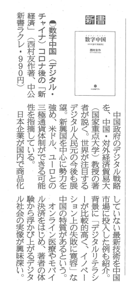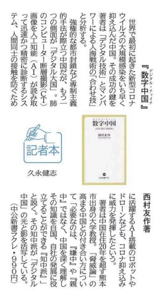 西日本新聞で、書籍『数字中国(デジタル・チャイナ)コロナ後の「新経済」』(中公新書ラクレ)を紹介していただきました。