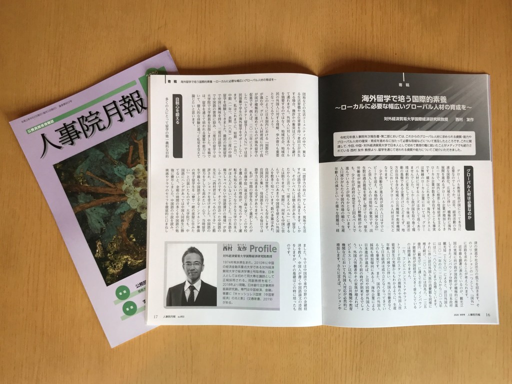 【人事院月報】海外留学で培う国際的素養~ローカルに必要な幅広いグローバル人材の育成を~ 2020/9/4 人事院月報9月号に「海外留学で培う国際的素養~ローカルに必要な幅広いグローバル人材の育成を~」と題して、寄稿しました。 人事院月報9月号目次はこちら